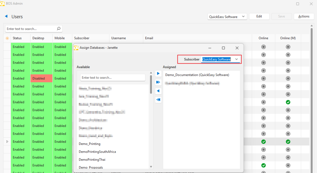 Navigation: BOS Tools > Admin (BOS) > Right click a Subscriber > View / Edit Users (context menu)