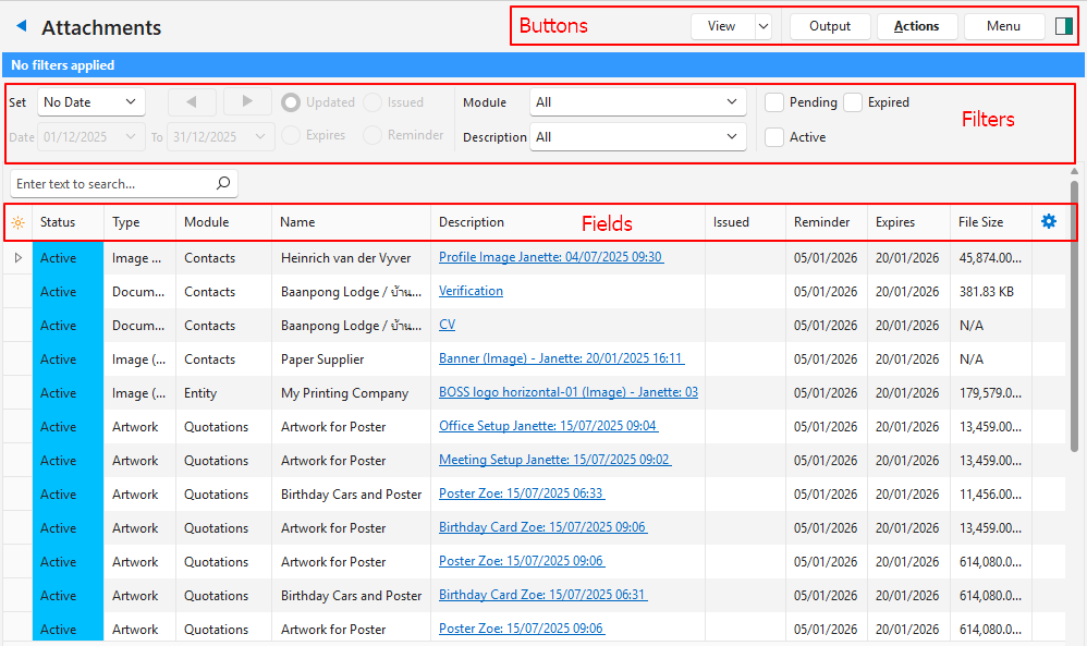 The Attachments module allows users to manage all their attachments from a single interface. This is especially helpful for managing attachments that have expiry dates (e.g. staff visas, work permits, customer credit applications).
