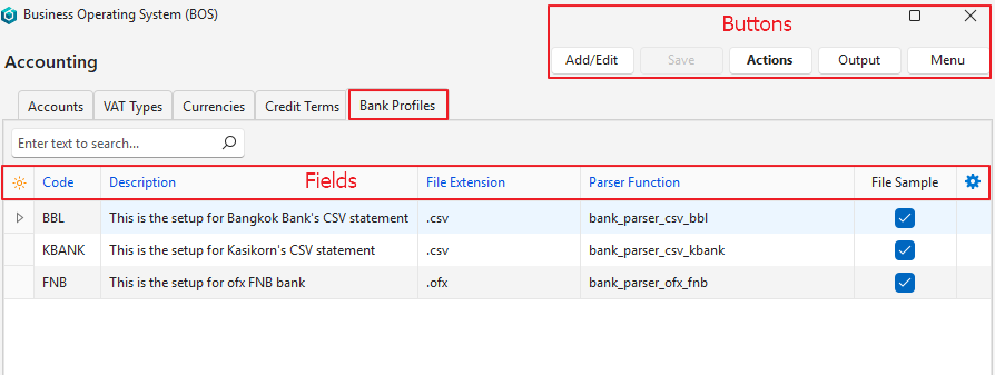 | Add/Edit | Allows a new bank profile to be edited or created. |