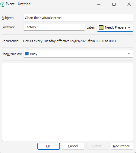 - Events can also be created by double-clicking an empty slot on the calendar. This pops up the form displayed on the screenshot below.