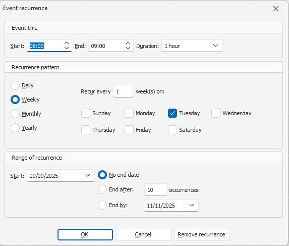 - Recurrence = Click one of the radio buttons to indicate how often the even recurs. The options are: