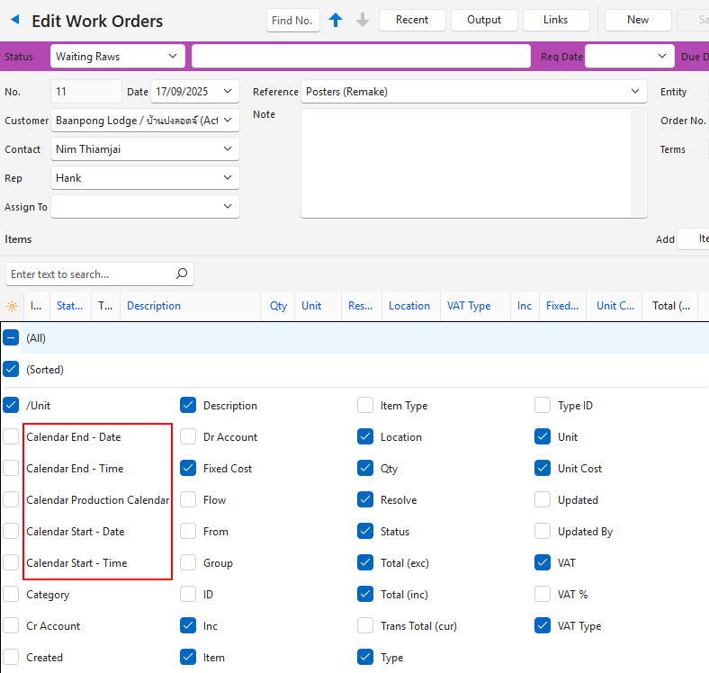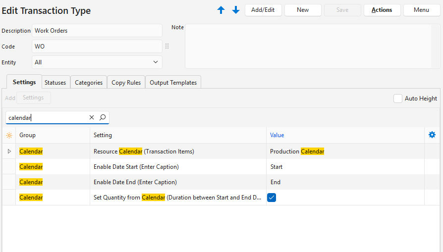 - Calendar > Resource Calendar (Transaction Items): Select a Calendar Type from the dropdown list.