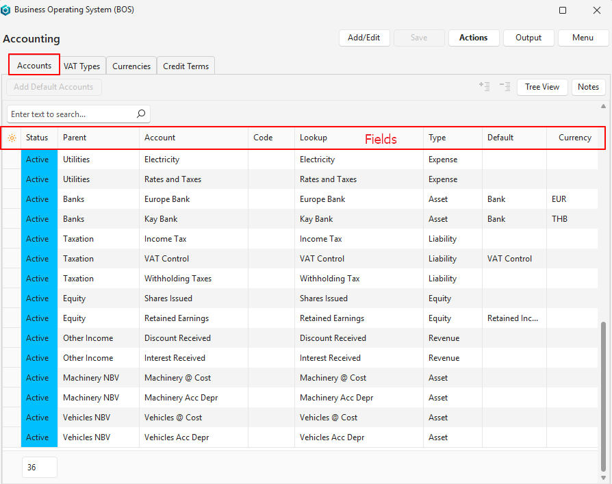 | Actions | Allows for changes to be made to multiple records that can be selected using Ctrl + Left Click. The options are: – Rebuild Accounting Report: Rebuilds the accounting report. This feature resets the financial reports and recreates them to include the new accounts. – Order Alphabetically: Sorts the accounts alphabetically within their categories or main accounts. – Generate Account Codes: Generates account numbers. – Generate Account Lookups: Generates account lookups for all the lowest level accounts. These lookups can be edited. Lookup lists are used in Transactions to help users find the account. – Refresh Lookups: Updates all the lookup lists. |