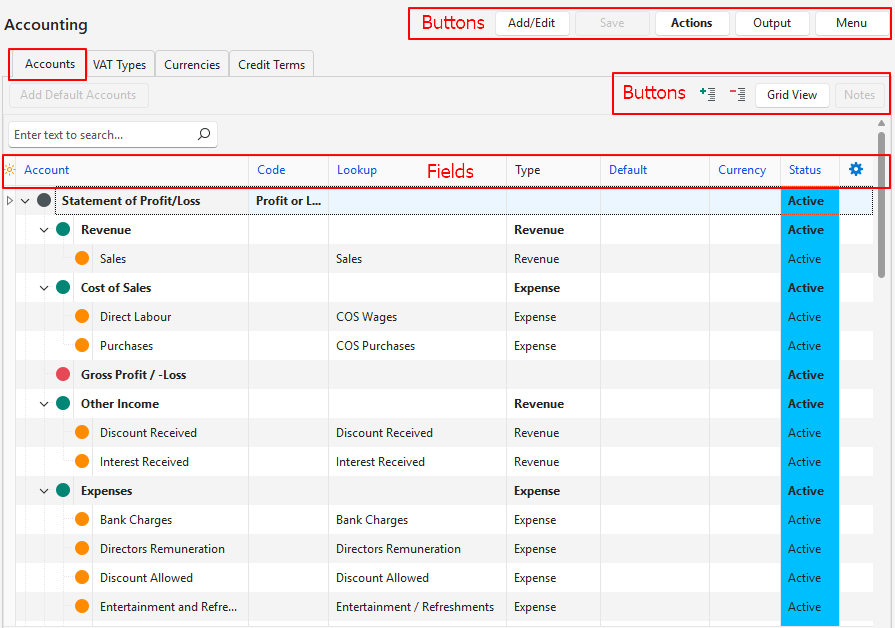 | Widget | A submenu that can also be accessed by right clicking the entry. The options differ depending on whether you clicked a Heading, an account on the Statement of Profit/Loss, or an account on the Statement of Financial Position. Statement of Profit/Loss: – Add Section > Revenue: Adds an additional Revenue section. Expense: Adds an additional Expense section. – Add Summary: Adds a sub-total. It will automatically add and subtract all the accounts above it. – Generate Account Lookup: Generates a lookup list only for that account which can be edited. Lookup lists are limited to the final accounts. (Lookup lists are necessary but can be entered manually.) – Nest Under: Creates the account as a sub-account of the selected account. Only applicable to accounts on the lowest levels. Once the account is used in a transaction, its nesting cannot be changed. – Move Up: Moves the account one line higher. – Move Down: Moves the account one line lower. – Delete: Deletes the account if there are no entries in the account. Statement of Financial Position: – Add Section > Asset: Adds an additional Asset section (e.g. Fixed Assets or Current Assets). Liability: Adds an additional Liability section (e.g. Long-term Liabilities or Current Liabilities). Equity: Adds an additional Equity section (e.g. Ordinary Shareholding, Preference Shareholding). – Add Summary: Adds a sub-total. It will automatically add and subtract all the accounts above it. – Add Account: Adds an account to the selected section or account. – Generate Account Lookup: Generates a lookup list only for that account. Lookup lists should be limited to the transaction accounts (i.e. not the headings). Lookup lists can be automatically generated, edited, or entered manually. – Nest Under: Creates the account as a sub-account of the selected account. Once the account is used in a transaction, its nesting cannot be changed. – Move Up: Moves the account one line higher. – Move Down: Moves the account one line lower. – Delete: Deletes the account if there are no entries in the account. |