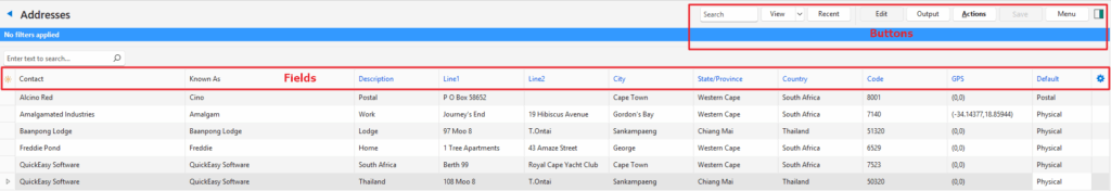 Actions | Allows for changes to be made to multiple records that can be selected using Ctrl + Left Click. The options are: Batch Update: Updates the following fields to the information typed in or selected in the adjacent block, once Update (button) is clicked, and confirmed. – Description – Line1 – Line2 – City – State/Province – Country – Code – Default Format: Formats the description so each word starts with an uppercase letter, and the rest is in lowercase. |