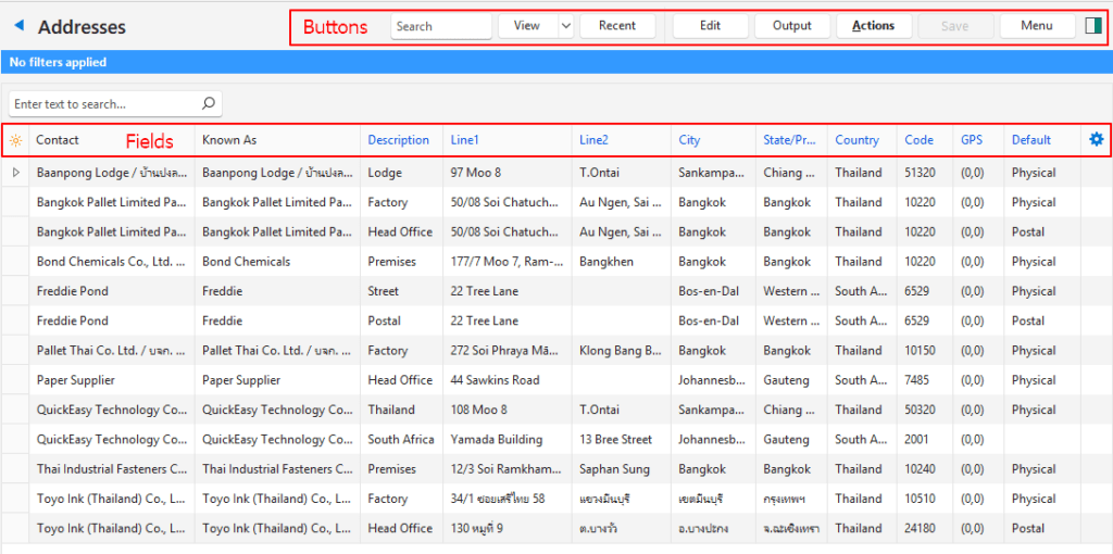 | Actions | Allows for changes to be made to multiple records that can be selected using Ctrl + Left Click. The options are: Batch Update: Updates the following fields to the information typed in or selected in the adjacent block, once Update (button) is clicked, and confirmed. – Description – Line1 – Line2 – City – State/Province – Country – Code – Default Format: Formats the description so each word starts with an uppercase letter, and the rest is in lowercase. |
