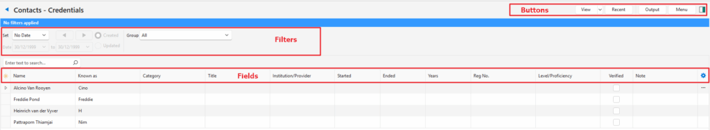 The Credentials List View displays contacts and their credentials such as their qualifications and skills.