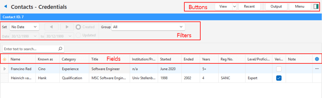The Credentials List View displays contacts and their credentials such as their qualifications and skills.