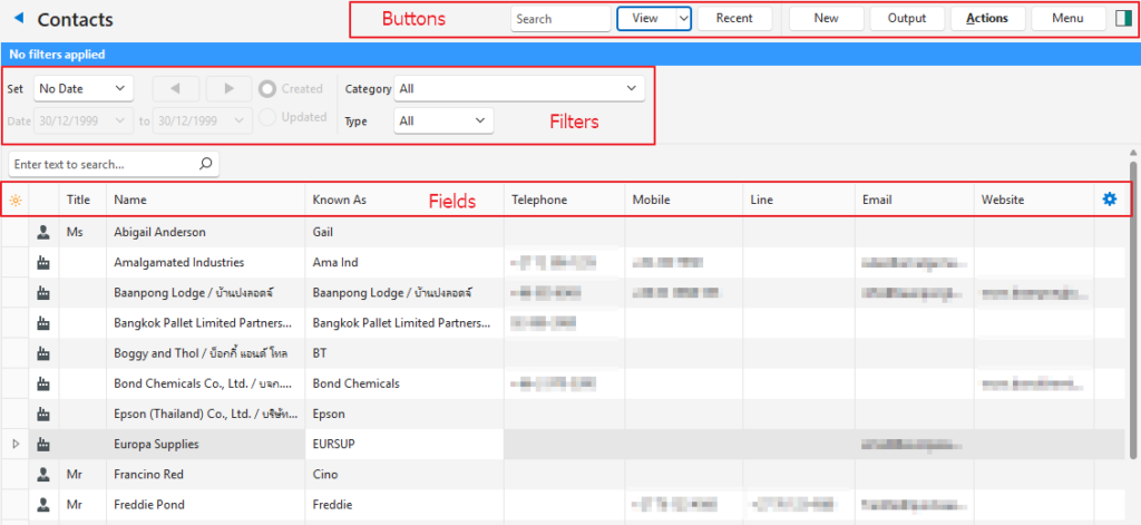 There are two List Views which display a list of Contacts with key information. Edit View allows users to add or edit the information (if they have the required authority).