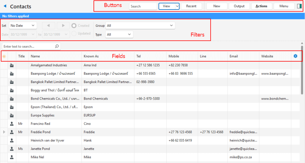 There are several List Views which display a list of Contacts with key information. Edit View allows users to add or edit the information (if they have the required authority).