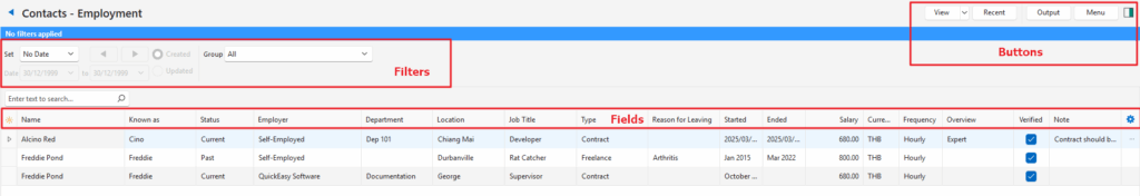 There are several List Views which display a list of Contacts with key information. Edit View allows users to add or edit the information (if they have the required authority).