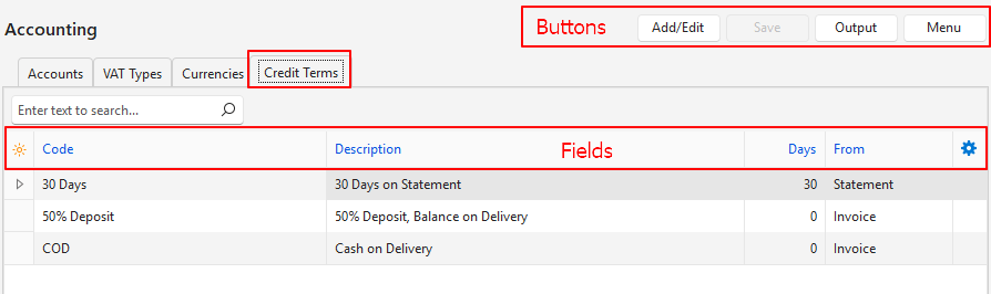 Navigation: Main Menu > Setup > Accounting > Credit Terms (tab)