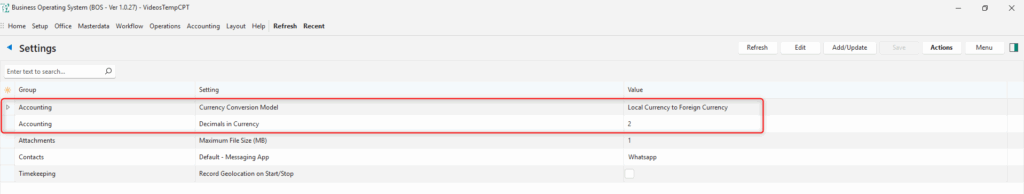 Accounting > General Settings > Currency Conversion Model | Choose the currency conversion model: – Local Currency to Foreign Currency: 1 of the Local Currency will buy x of the Foreign Currency. – Foreign Currency to Local Currency: 1 of the Foreign Currency will buy x of the Local Currency. |