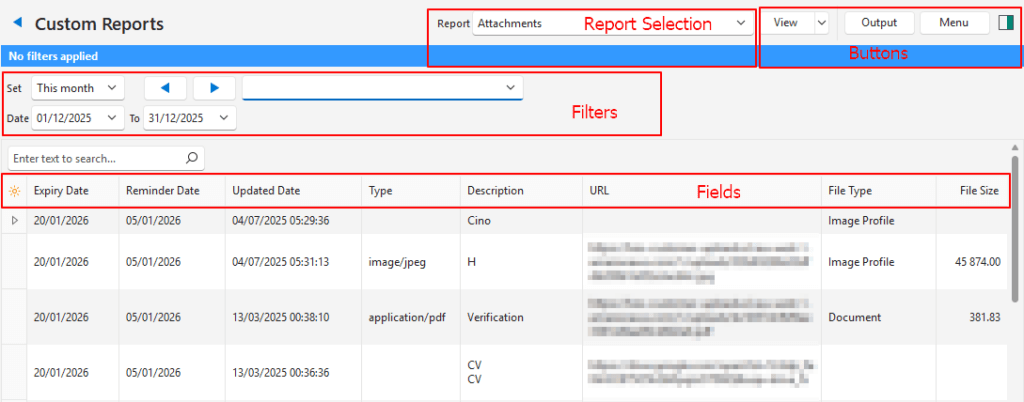| Report (top row) | A dropdown list of all the custom reports for users to select one. If a User does not have access, the report does not appear on the dropdown list for that user. |