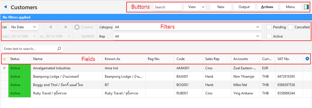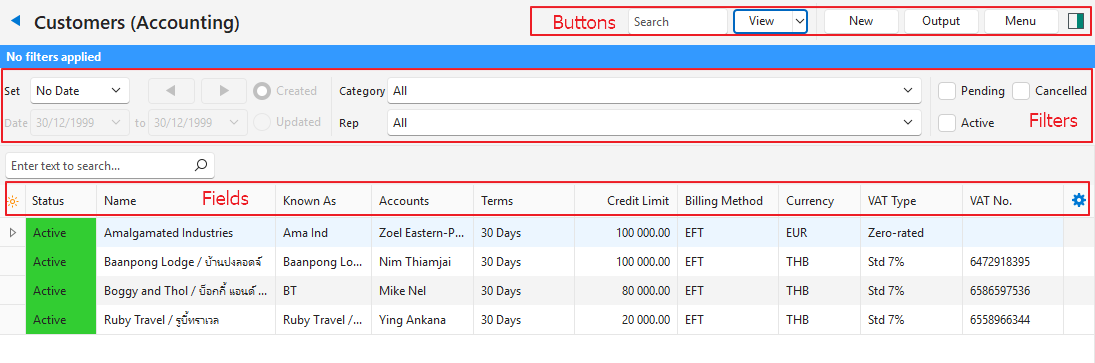 There are two Views. List View displays a list of Customers with names and key information. Edit View allows users to add or edit Customer information (if they have the required authority).