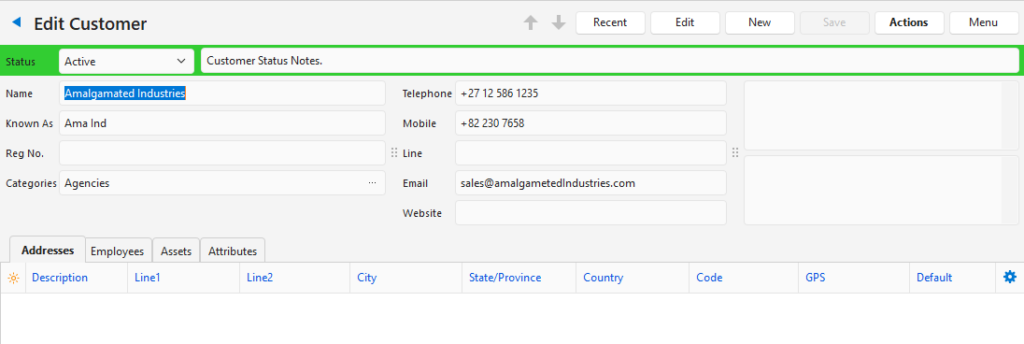 All the relevant Customer information can be entered in QuickEasy BOS, including contact details, addresses, registration information, and credit terms.