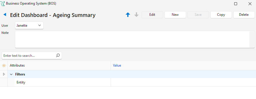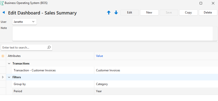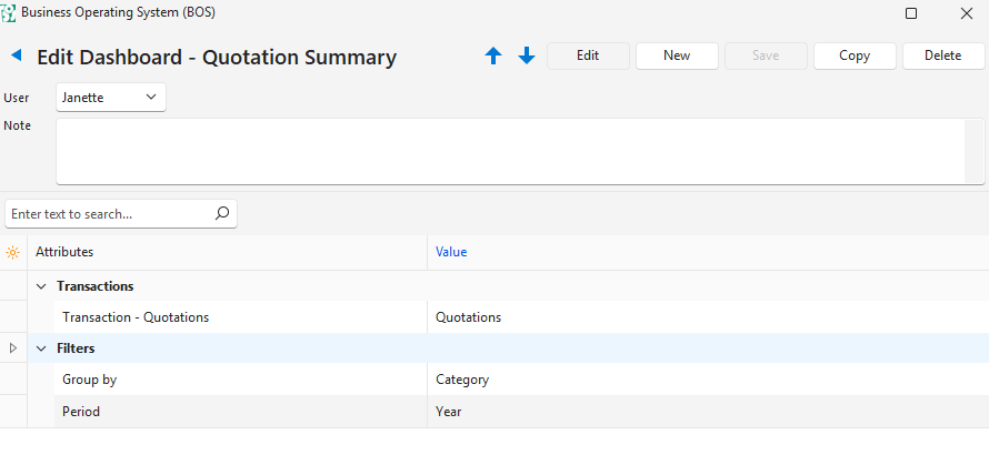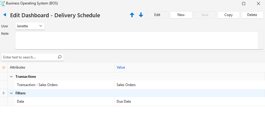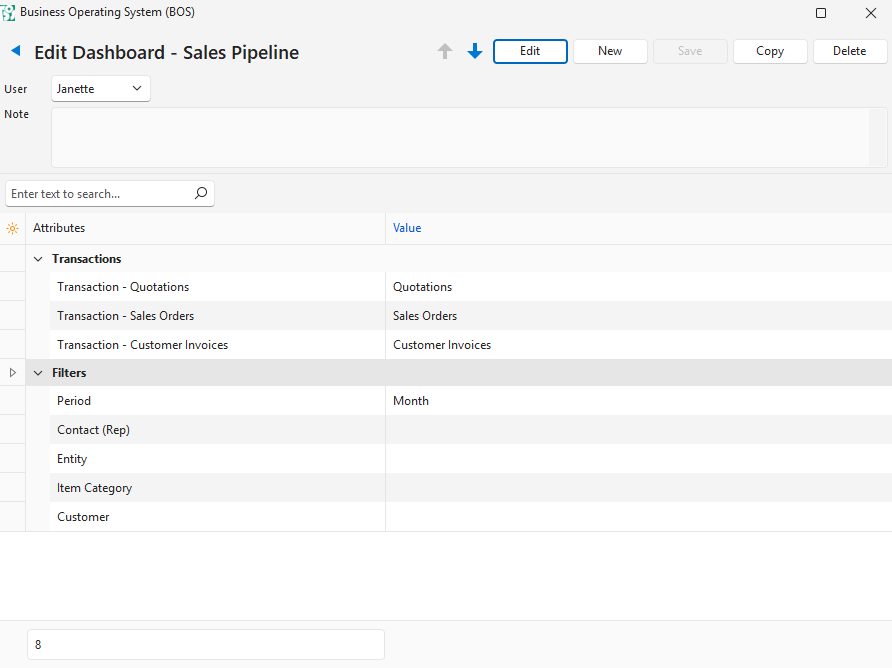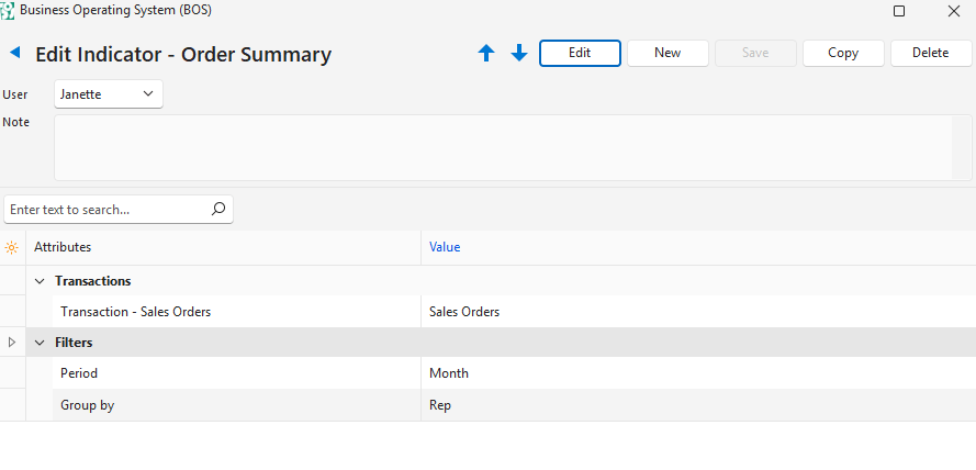 New | Creates a new indicator as selected on the dropdown list. The options are: – Sales Pipeline: Displays selected transaction-type totals. – Production Loading: Displays work orders per entity. – Delivery Schedule: Displays sales orders per due or required date. – Quotation Summary: Displays quotations grouped by category or rep. – Sales Summary: Displays customer invoices grouped by category or rep. – Order Summary: Displays sales orders group by category or rep.- – Ageing Summary: Displays the customer-and-supplier-age-analyses totals per entity. |