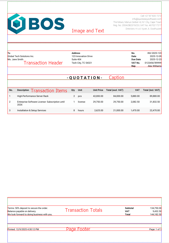 The BOS Document Designer is a flexible designer that allows organisations to create and customise their own forms such as invoices and quotations. These forms can be output in JSON, HTML or PDF.