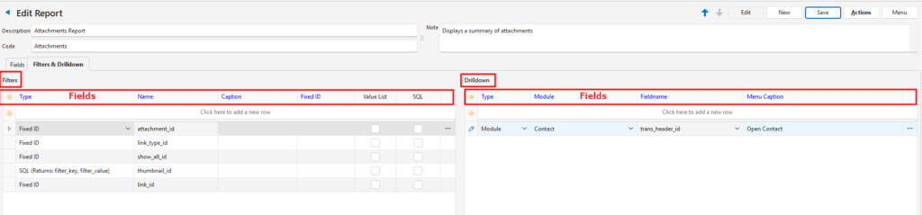 Fieldname | A dropdown list of all the field names, for users to select one for the drilldown function.The selected field name should be the primary key (ID) for that module. |