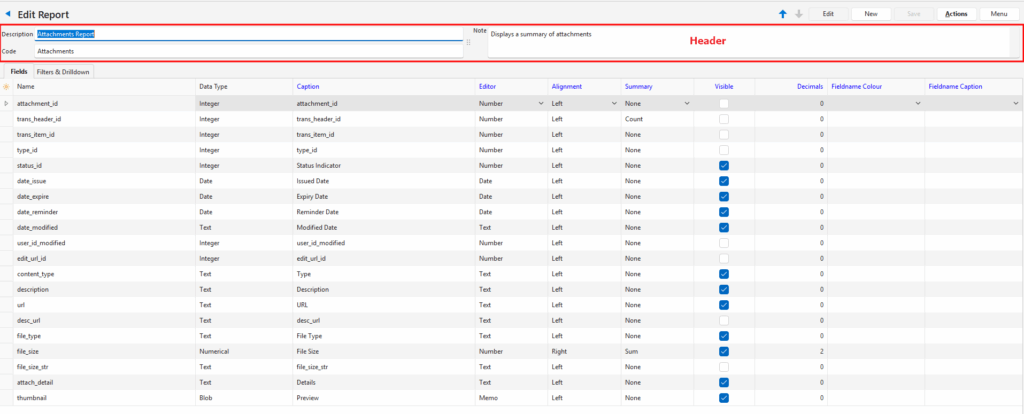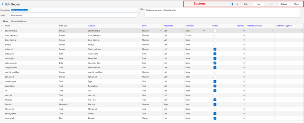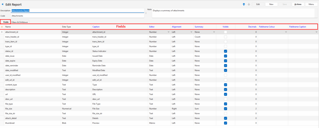 Visible | Checkbox. If checked the field is visible in the report. Should be checked for fields that contain the data that is displayed in the report. Should be unchecked for fields that contain the functions being used in other fields (e.g. custom captions or colour changes). May be unchecked for fields that contain the database or entry ID. |