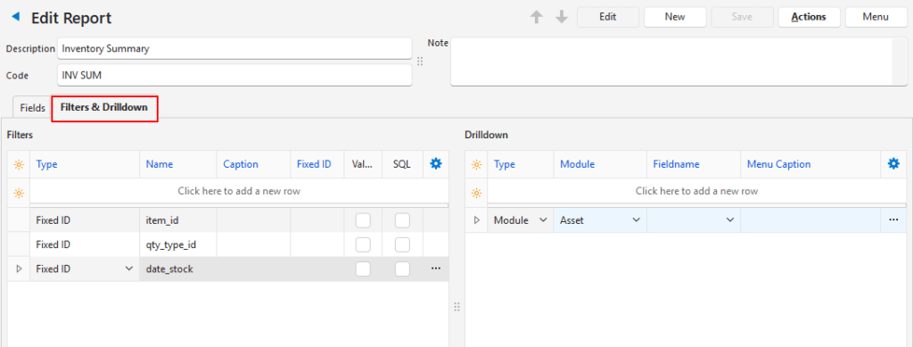 | Fieldname | A dropdown list of all the field names, for users to select one for the drilldown function. The selected field name should be the primary key (ID) for that module. |