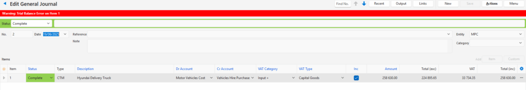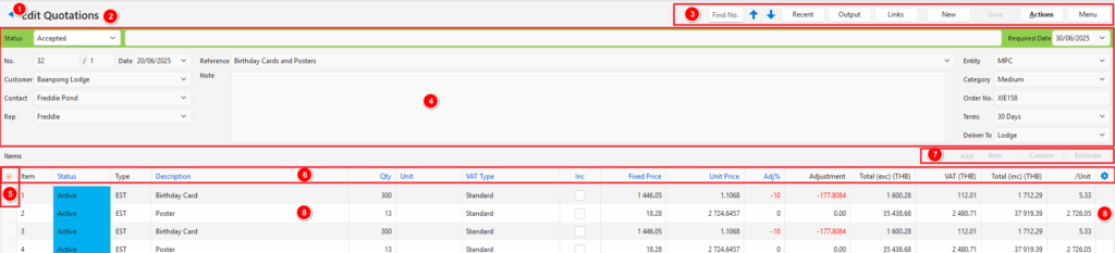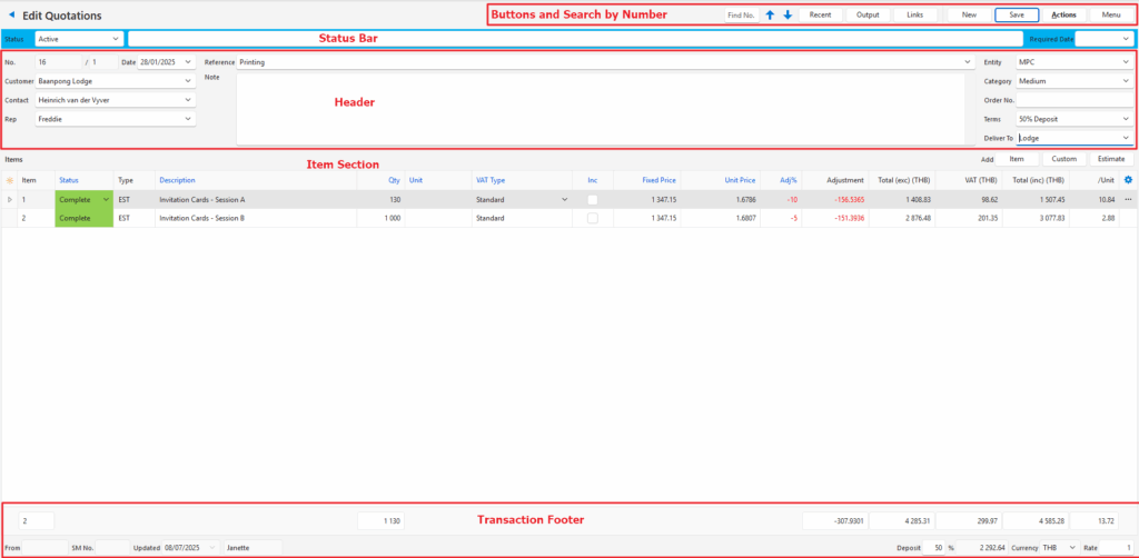 Header | Dropdown lists with information relating to the transaction (e.g. Customer or Supplier Names, Categories, Order Numbers). |
