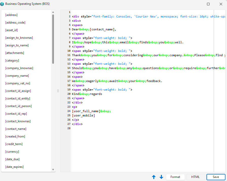 Navigation: Main Menu > Setup > Output Templates > Right click an entry > Edit Email Body