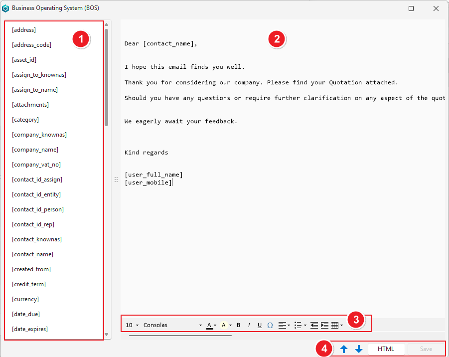 - BOS Document Designer Interface: Explains the interface from which custom documents (e.g. quotations and invoices) can be designed.