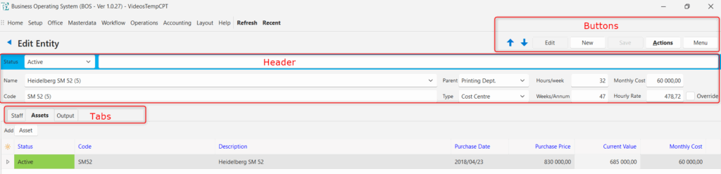 Widget | Allows users to Edit or Delete the record. If the entity cannot be deleted, a popup will explain why. Entities can only be deleted if: All Entities: -There are no linked Assets. -There are no linked Staff. Cost Centres: -There are no linked Service Attributes on Items. -There are no linked Costing Services on Items. Locations: – There are no linked Transaction Items. – There are no Items with linked Locations (Inventory (tab)). Registered Entities: – There are no linked Transactions (Entity selected in the transaction header). |