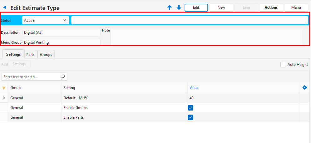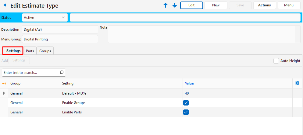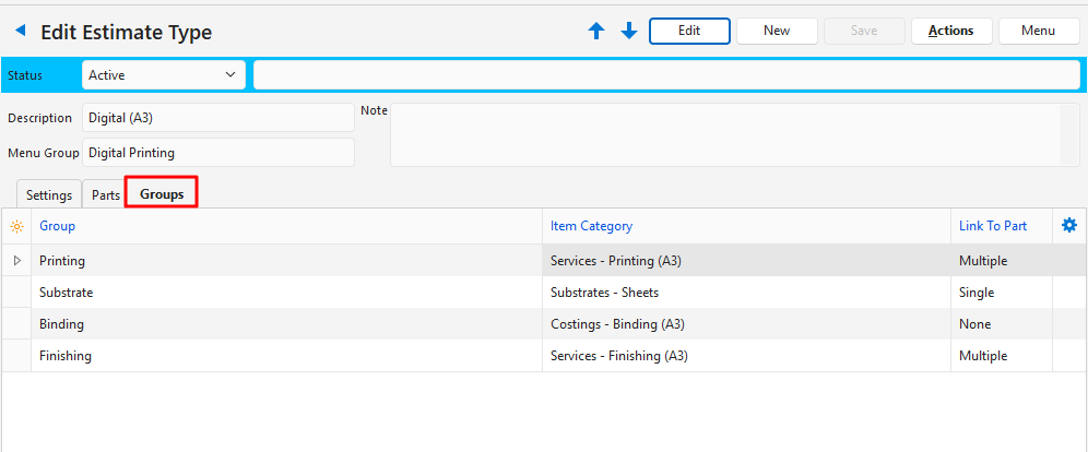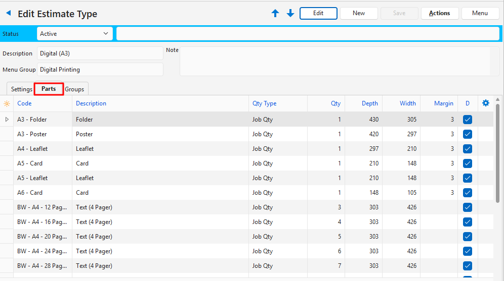 This is an example of an Estimate Type for Digital Printing products. This example is based on Digital (A3) jobs.
