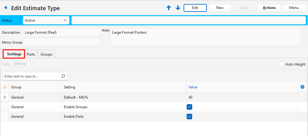 Navigation: Main Menu > Setup > Estimate Types > New (button)