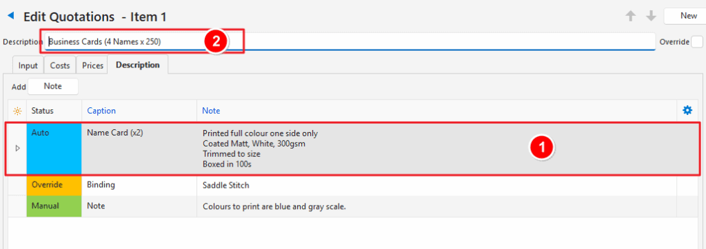 - Note: The estimate’sdescription appears on a printed or emailed document (e.g. Quotations) (see 1 on the screenshot).