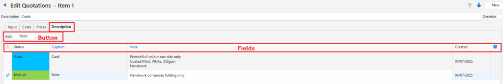 Widget | A submenu, which can also be accessed by right clicking the entry, with the following functions: – Auto: Automatically generates the description. – Override: Allows users to edit the description. – Delete: Only appears on Note fields. Allows users to delete the Note. |