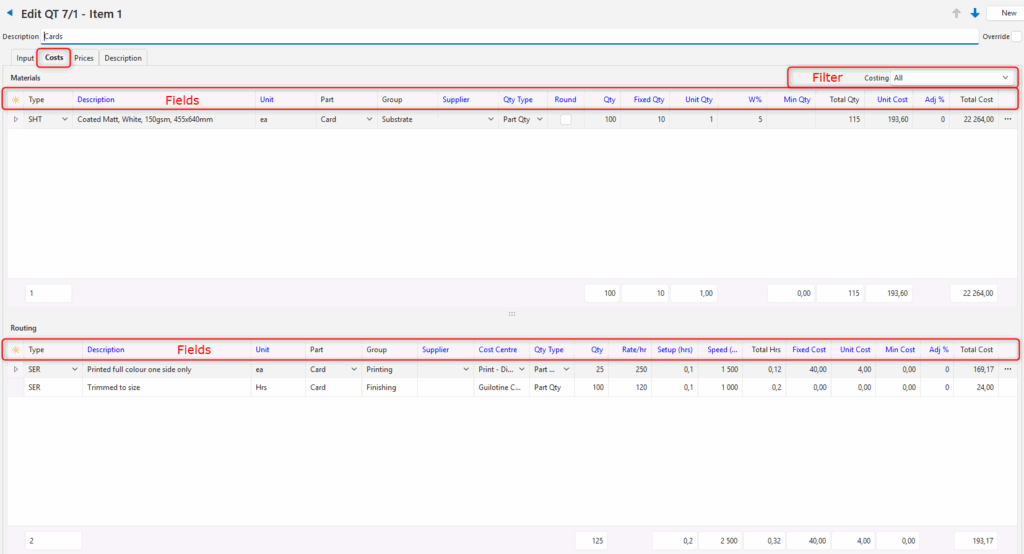 - The Material and Routing Costs are summed to the Fixed Cost and Unit Cost fields in the Prices table (Prices tab).