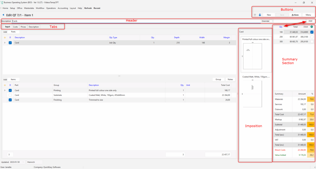 This page explains the interface users encounter when adding an Estimate to a Quotation. Fields marked in blue in QuickEasy BOS are editable.