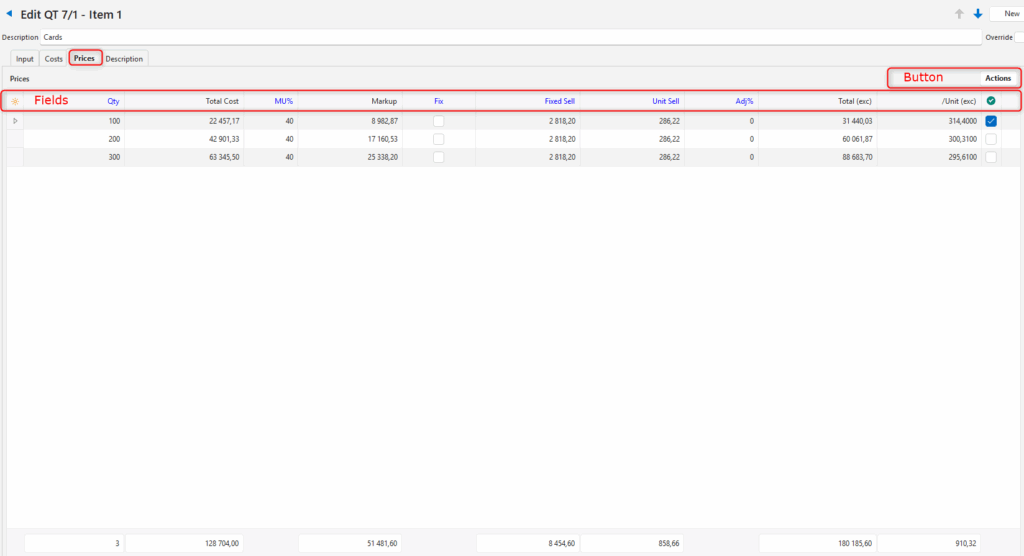 Unit Sell | The Unit Selling Price. Only editable if the checkbox in the Fix column is checked. |