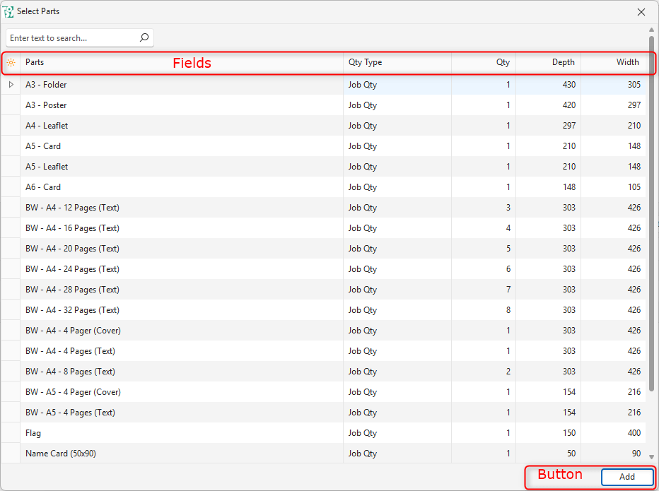 The Parts popup is displayed if Parts (button) is clicked. Users can select the parts to add.
