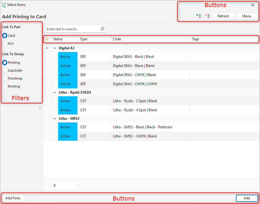 Add (bottom right corner) | Adds the selected items to the Estimate. |