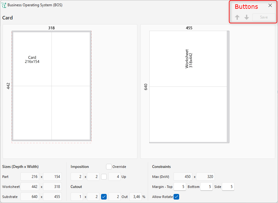 Fields that display the number of items that can fit on a Worksheet (e.g. 2 x 2 Up). Checkbox to indicate this option is Active (if checked). | |