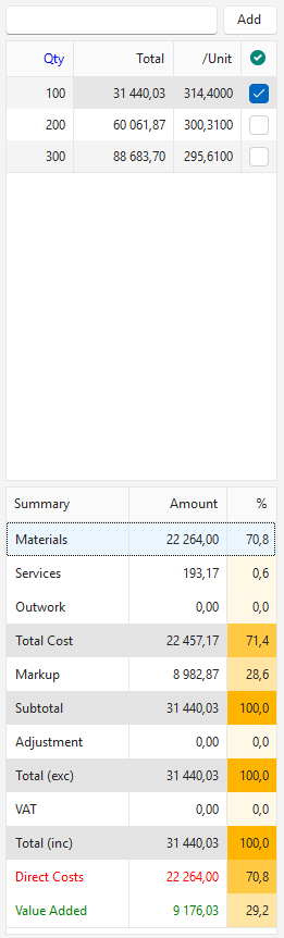Summary | A list of all the items that are part of the estimates. Direct Costs are displayed in red. Value Added is displayed in green. |