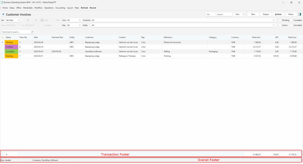 Calculated Value ColumnsColumns with calculated Totals (e.g. Total (exc), Total (inc) will have a total at the bottom of the screen that tallies the column).