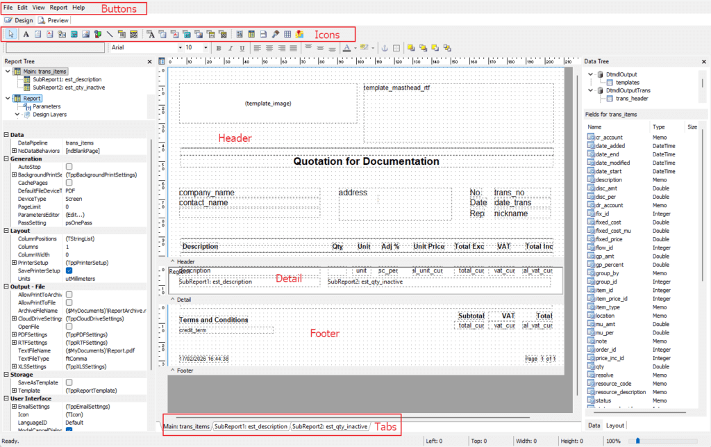 | Header | The header section typically contains the following fields: – Company Logo – Company Address – Name of the Form / Report – Address of the recipient – Document Number – Document Date – Rep – Headings for the report detail |