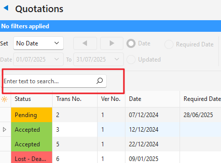 Position | A Search bar, when available, is displayed to the left and directly above the grid. It is only displayed once the list of entries is displayed (i.e. View (button) clicked). |