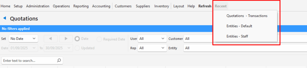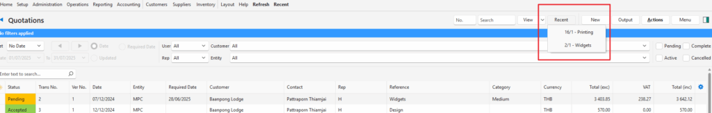- The Recent button, on edit views, displays the transaction numbers that were recently viewed or edited of the same transaction type. Click an entry to open that transaction.