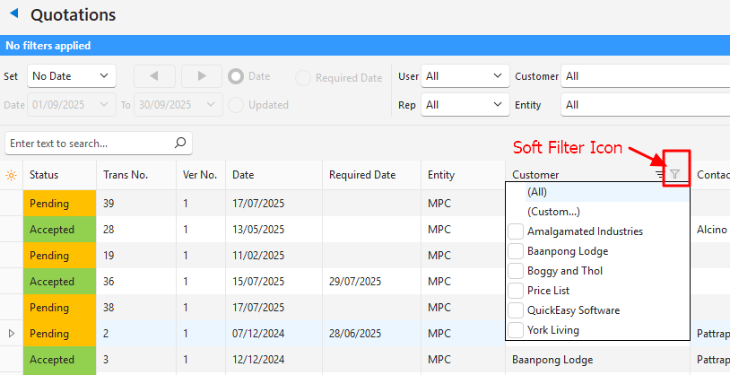 Accessing the filter | The filter is accessed by hovering a mouse over the header until the Soft Filter Icon is displayed (a funnel). (See screenshot above this table.) |