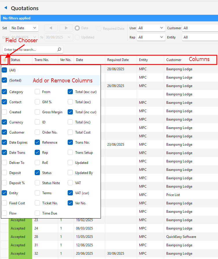 Adding Columns | Columns can be added using the Field Chooser (*) in the first column. This field displays all the columns. The Field Chooser (*) is also available from the context menu (right-click any column header). |