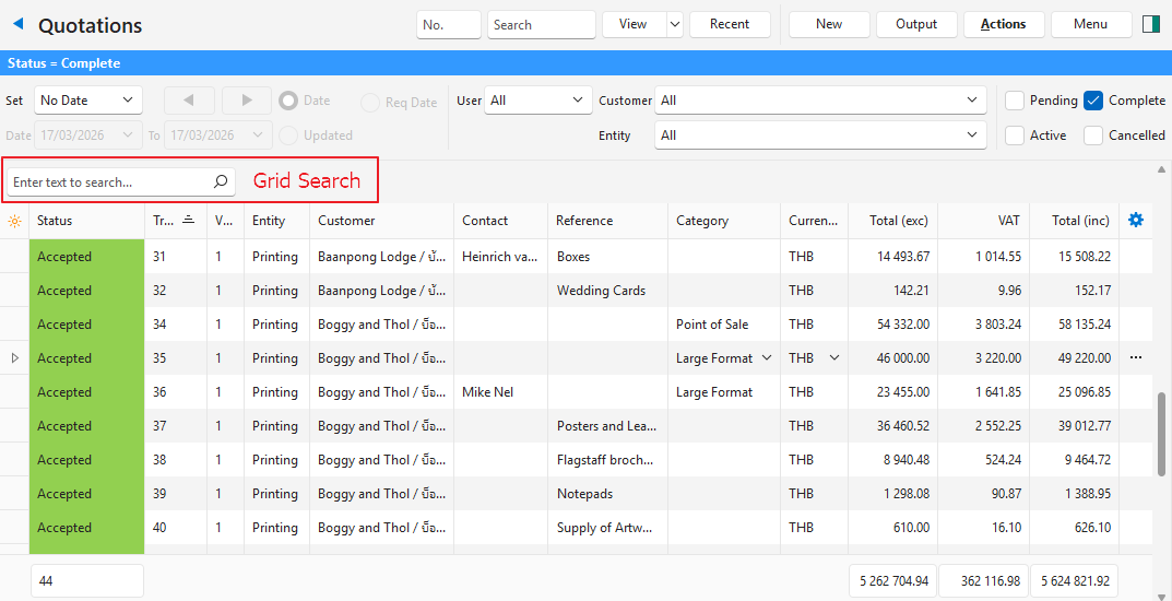 | Position | A Search bar, when available, is displayed to the left and directly above the grid. It is only displayed once the list of entries is displayed (i.e. View (button) clicked). |