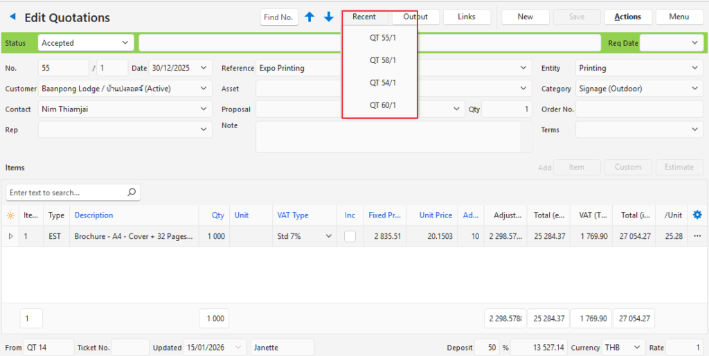 The Recent button, on edit views, displays the transaction numbers that were recently viewed or edited for the same transaction type. Click an entry to open that transaction.