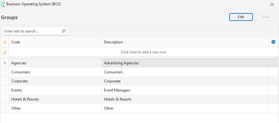 - Code = Type a descriptive abbreviation for the group (e.g. Ad Agencies).