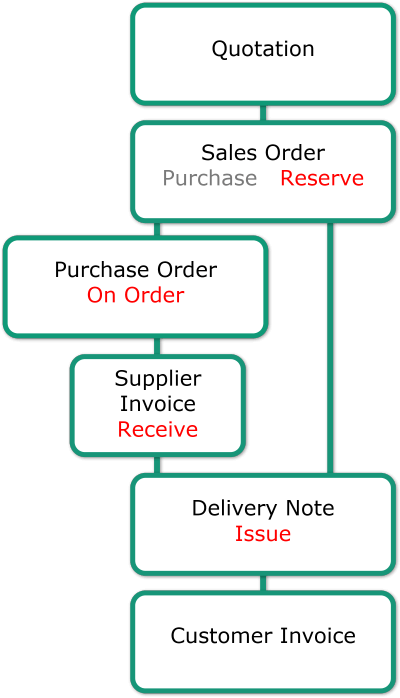 Sales Order | Checked for Active only | Inventory is only checked when the Sales Order is Active. When the Sales Order is Complete it should no longer affect inventory. | Item is in stock = Reserve Item must be made = Produce Item must be purchased = Purchase | The stock on hand must be reserved so that it is booked for the order. The Produce and Purchase resolves do not affect inventory. They assist with Copy Rules so that the correct items are copied to the correct transaction. |